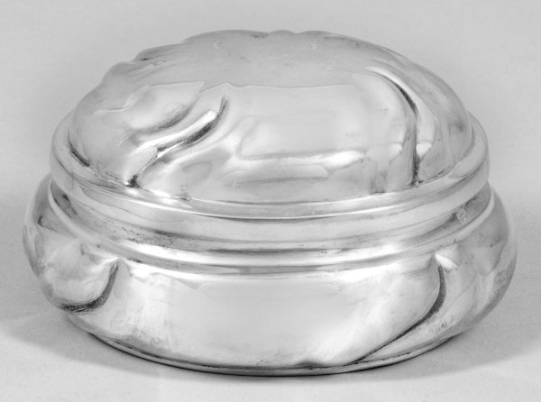 Barock-Zuckerdose Silber. Über kurzer Standfläche stark bauchiger Korpus. Wandung und aufgewölbter Stulpdeckel gegliedert durch passig geschweifte Züge. Innen vergoldet. Gest., Tremolierstrich, Stadtmarke, Jahresbuchstabe F, Meister George Kahlert d. J. (wird Meister 1732). Gew. ca. 120 g. H. 6 cm. 11,2 cm x 9,2 cm.