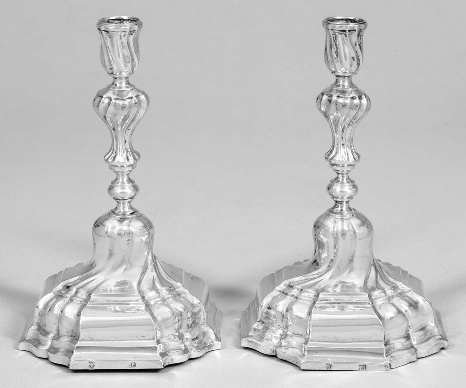 Paar Rokoko-Tafelleuchter Silber. Über hoch aufgewölbtem Stand mehrfach gegliederter Balusterschaft mit kelchartiger Tülle. Leuchter flächendeckend gegliedert durch schmale, passige Grate. Gest., Stadtmarke, bisher unidentifizierte Meistermarke IP. Gew. zus. ca. 475 g. H. 19 cm.