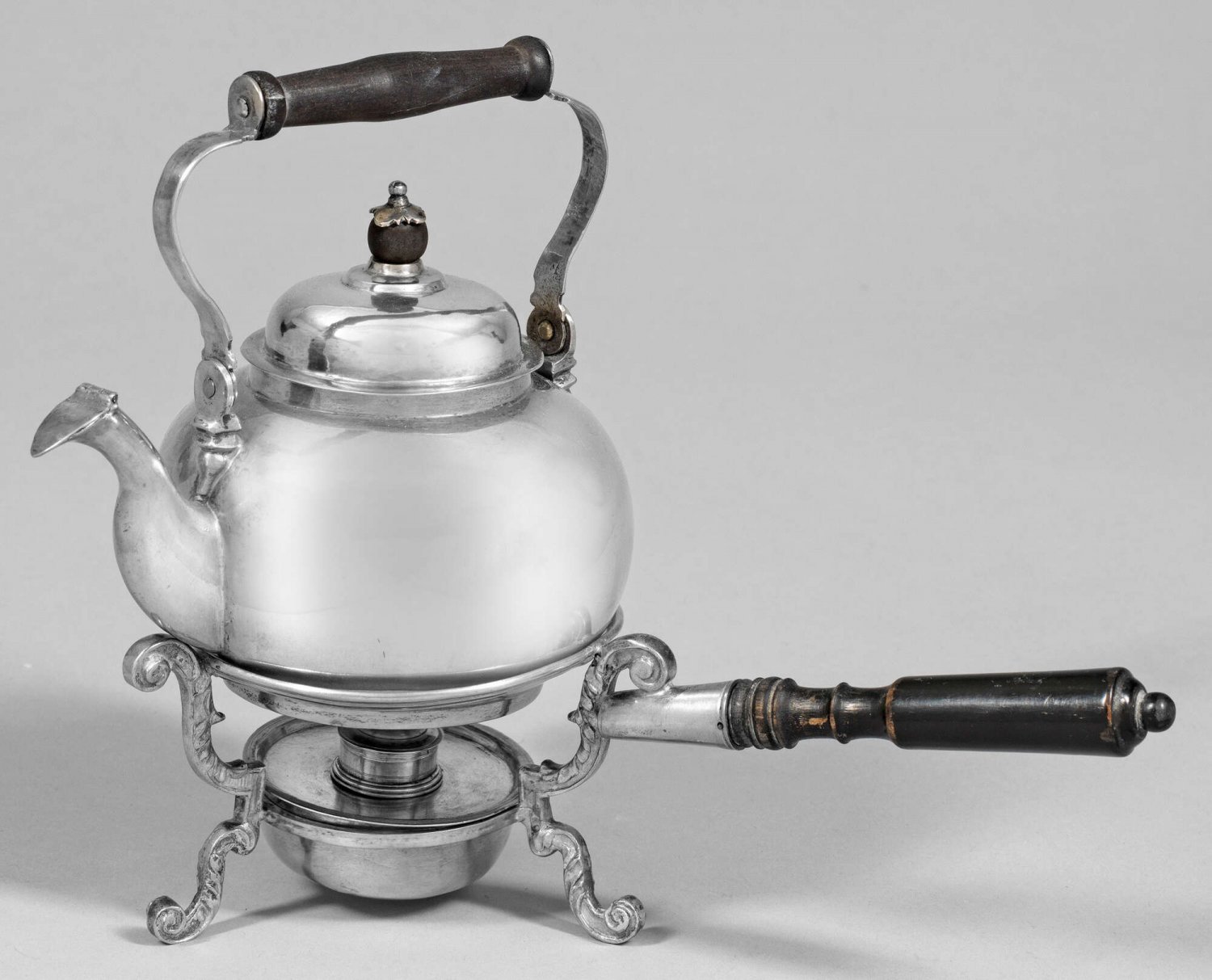 Kleines Barockkännchen und Rechaud Silber. Kugeliger, glatter Korpus über kurzem Standring. Tief angesetzter Ausguss mit scharnierter Abdeckung sowie übergreifender Bandhenkel mit gedrechselter, ebonisierter Griffzone aus Holz. Gewölbter Deckel. Von drei Volutenbeinen getragener Rechaud mit seitlichem Balustergriff aus ebonisiertem Holz und zentralem Brenner. Teekanne innen vergoldet. Altersgemäße Gebrauchsspuren. Gest., Tremolierstrich, Stadtmarke, Jahresbuchstabe q bzw. u, Meister Christian Schultz (I) (wird Meister 1706) sowie Meister Samuel Grewe (wird Meister 1712). Gew. zus. ca. 545 g. H. 19 cm.