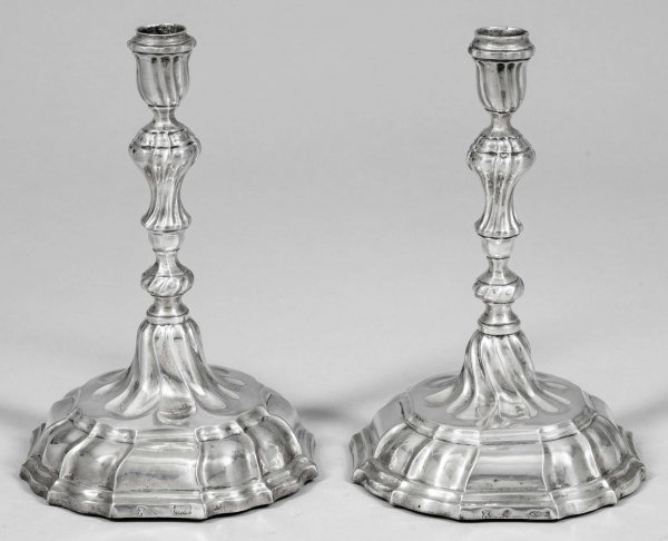 Paar Rokoko-Tafelleuchter Silber. Hoch aufgewölbter, von passigen Zügen gegliederter Stand, beschwert. Über rosettenförmig gemuldetem Ansatz hoher, mehrfach gegliederter, fassonierter Balusterschaft. Vasenförmige Tülle. Gest. 12 Lot, Stadtmarke, Jahresbuchstabe C, Meister Johann Christoph Schmidt (wird Meister um 1768) sowie Meistermarke Neudhard. Beschwert. H. 21 cm - 21,5 cm.