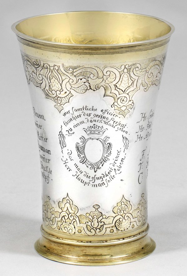 Seltener Rokoko-Regimentsbecher Silber, teilvergoldet. Über ausgestelltem Stand sich konisch erweiternder Korpus. Wandungsränder umlaufend graviert und punziert in Form von dekorativen Rocaillen. Schauseitig bekrönte Kartusche, umlaufend Sinnspruch "Wier samtliche Officier thun hier das gering present zu einen denckmahl geben das man die gesundheit drinck Herr Hauptman solle leben". Rückseitig vier Spalten mit Namen der schenkenden Regimentsangehörigen. Gest., Tremolierstrich, Stadtmarke, Meister Johann III Mittnacht (wird Meister 1735). Gew. ca. 135 g. H. 11 cm.