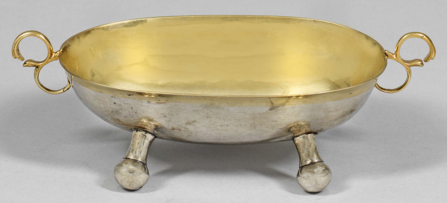 Barock-Henkelschale Silber, teilvergoldet. Von drei ausgestellten, hohen Kugelfüßen getragener, ovaler Korpus mit geringfügig ausschwingendem Rand. An den Schmalseiten s-förmig geschwungene Henkel. Auf der Bodenunterseite gravierte, dat. Widmung "Peter Paulsen verehret D. S. Gevatter 1771". Minim. rest.; Undeutl. gest.; Gew. ca. 160 g. H. 6,5 cm. 21,2 cm x 11 cm.