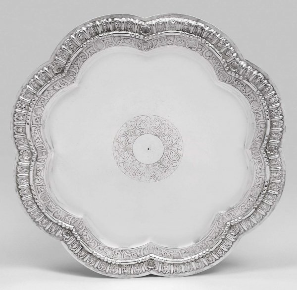 Kölner Präsentierteller Achtpassig geschweift, im glatten Spiegel fein gravierte Blattbordüre. Breite Fahne flächendeckend meisterhaft reliefplastisch getrieben und graviert in Form von Muschelwerk, Quasten und Pfeifendekor. Gest., Tremolierstrich, Stadtmarke, Meister Constantinus Maas (wird Amtsbruder 1713). Gew. ca. 340 g. D. 31,8 cm.
