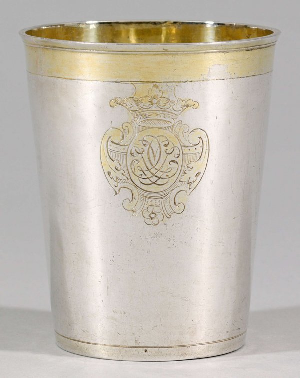 Königsberger Becher Silber, teilvergoldet. Sich konisch erweiternder Korpus mit glatter Wandung und von schmalen Profillinien akzentuierten Rändern. Schauseitig fein gravierte Wappenkartusche mit einem bekrönten, ligierten Monogramm. Innen vergoldet. Gest., Tremolierstrich, Stadtmarke, Jahresbuchstabe y, Meister Michael Christian Hetsch I (wird Meister 1695). Gew. ca. 170 g. H. 11 cm.