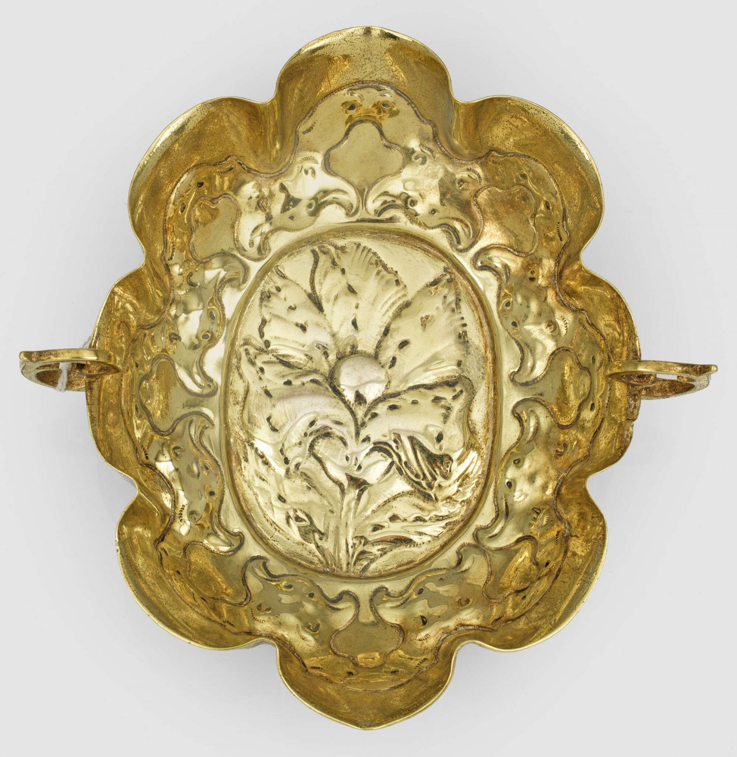 Augsburger Branntweinschale Silber, teilvergoldet. Tief gemuldete, achtfach ausschwingende Form, in der unteren Wandungshälfte umzogen von dekorativ getriebenen Ornamenten im Ohrmuschelstil. Im abgesetzten Spiegel große, reliefplastisch getriebene Blume. Minim. rest.; Gest., Tremolierstrich, Stadtmarke, Meister Philipp Jakob II Drentwett (wird Meister um 1644) oder Philipp Jakob III Drentwett (wird Meister 1669). H. 3 cm. 14 cm x 13 cm. Gew. ca. 90 g.