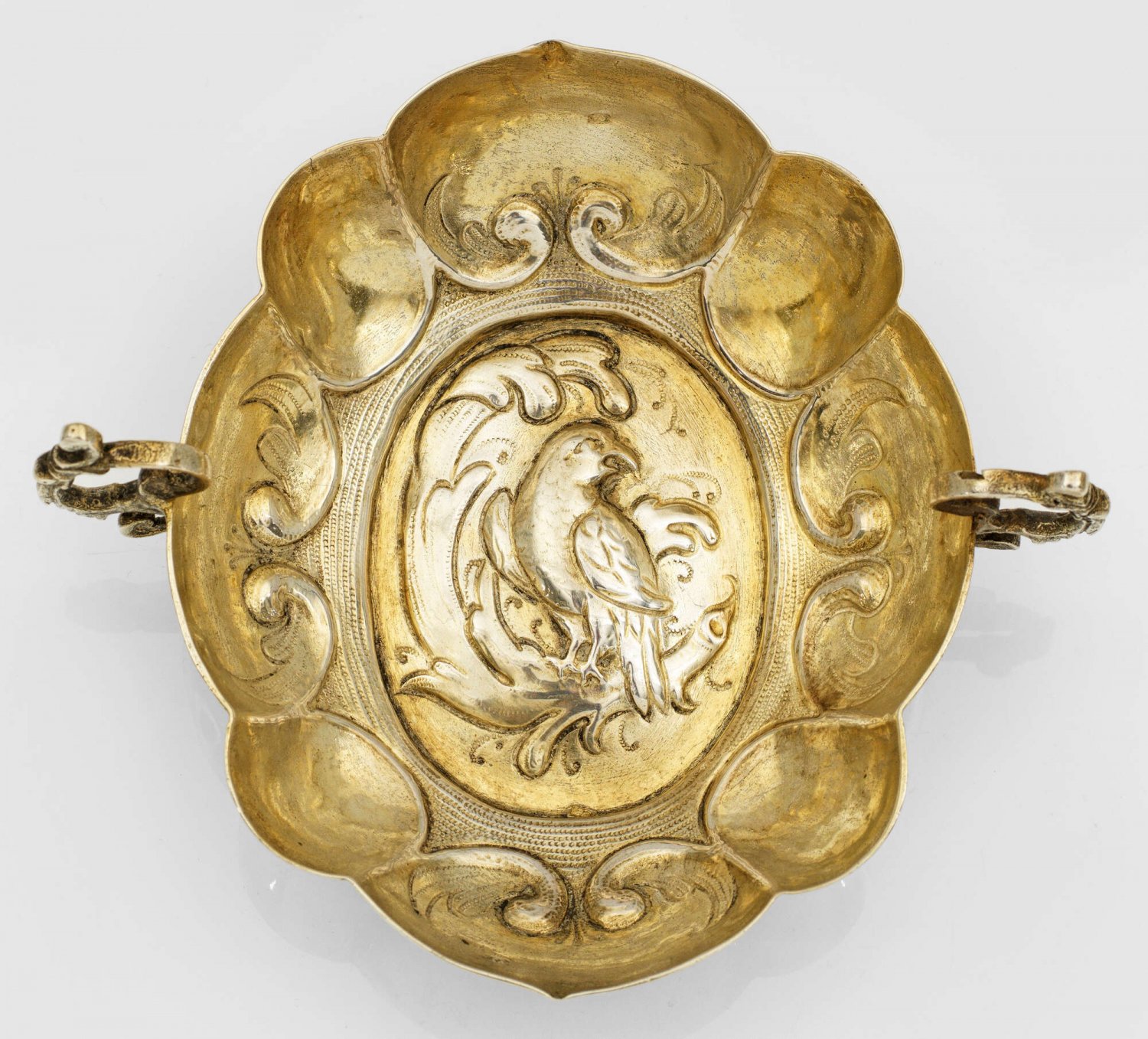Qualitätvolle Salzburger Barock-Branntweinschale Silber, teilvergoldet. Ovaler, achtpassiger Korpus mit gering geweitetem Rand. Im vertieften Spiegel hochreliefplastisch getriebene und fein punzierte Darstellung eines, auf einem Zweig sitzenden Papageis. Darstellung gerahmt von reliefierten Voluten. Schmale Volutenhenkel. Gest., Stadtmarke, Meister Hans Caspar Ainhorn (wird Meister 1635). Gew. ca. 115 g. H. 3 cm. 14 cm x 13 cm.