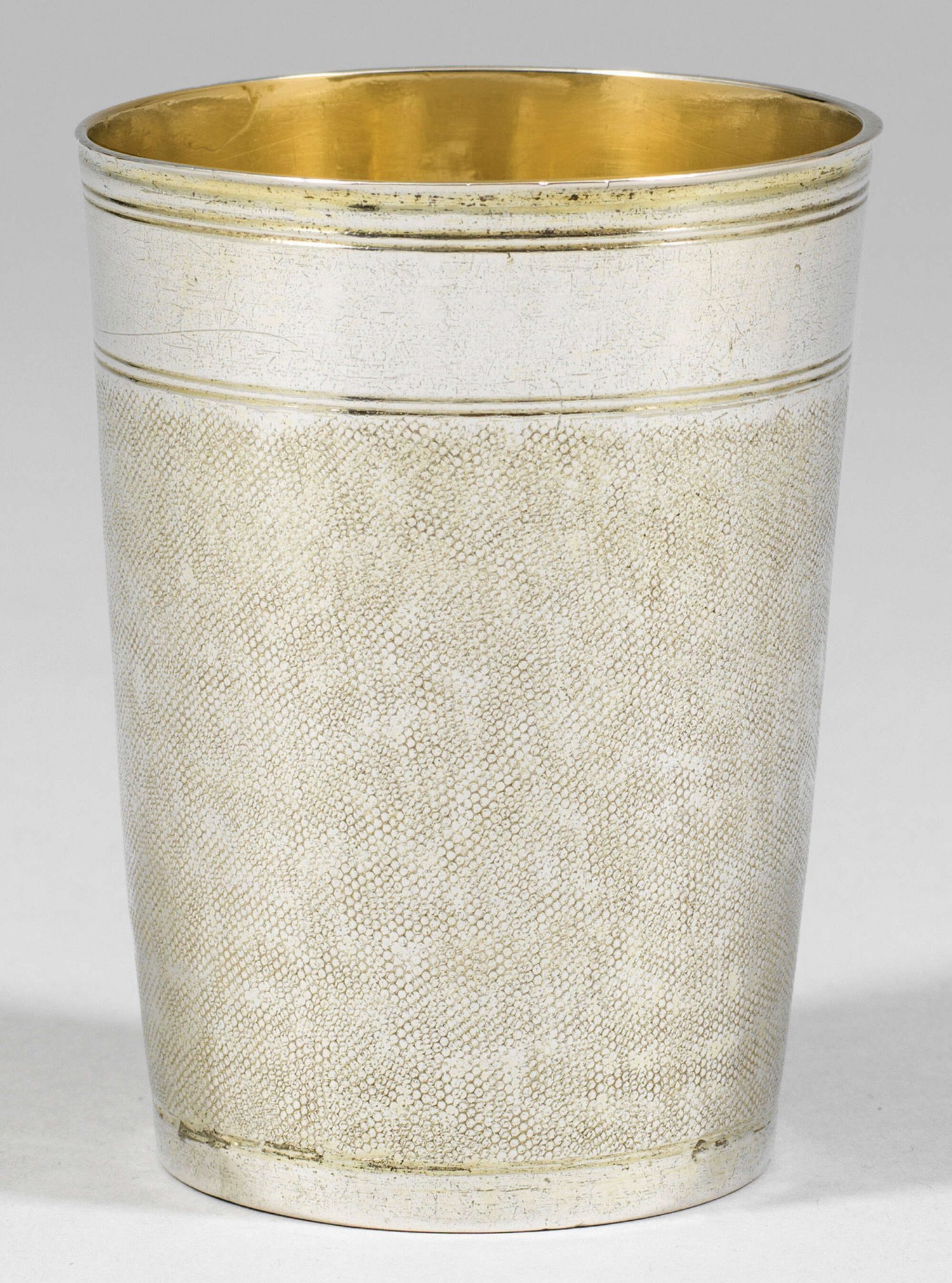 Schlangenhautbecher Silber, vergoldet. Oben und unten Profilrahmung, dazwischen flächendeckendes Schlangenhautmuster. Gest. Stadtmarke N, Meisterzeichen TR ligiert in Schild für Thomas Ringler (wird Meister 1661), Tremolierstrich. Gew. ca. 150 g. H. 9 cm.