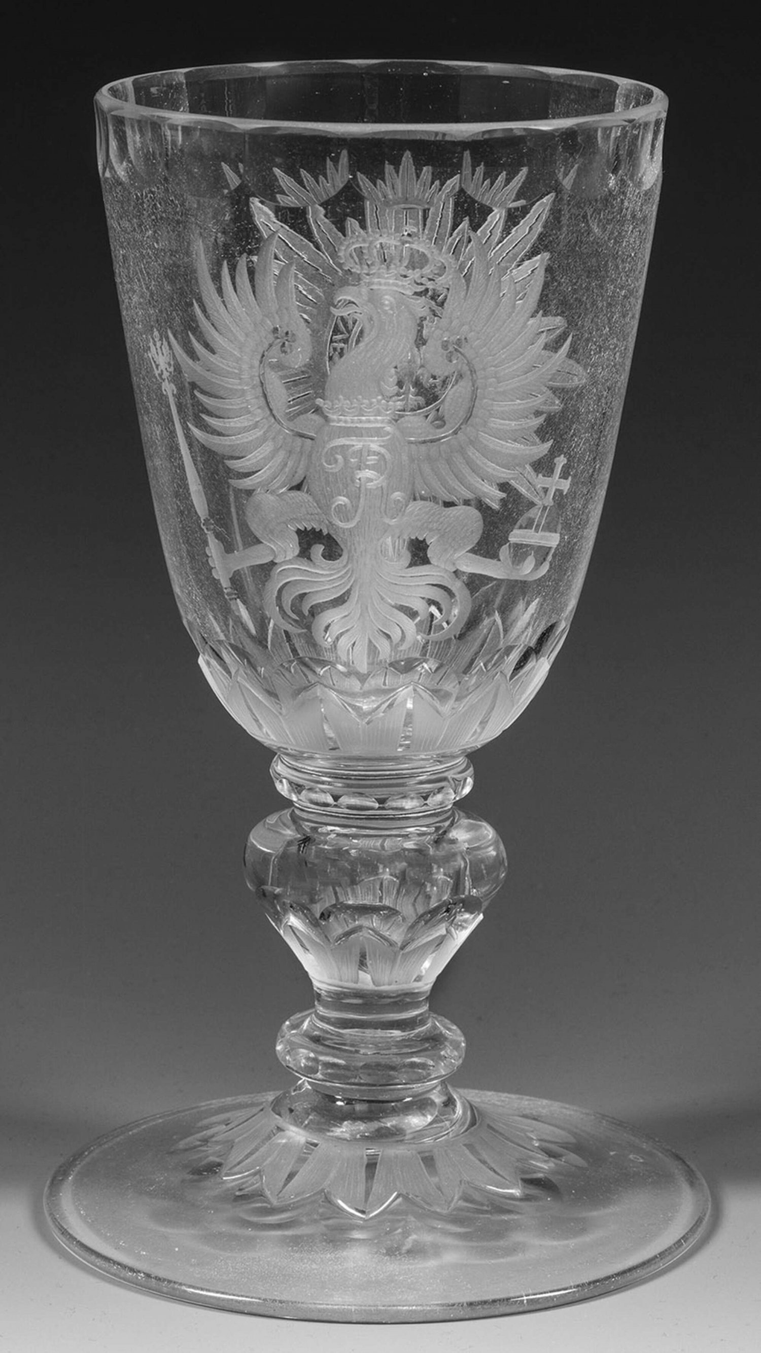 A cut and engraved Potsdam Baroque glass goblet decorated with the Prussian eagle, the Monogramm of King Frederick I of Prussia and the star of the Order of the Black Eagle. Minor crizzling.