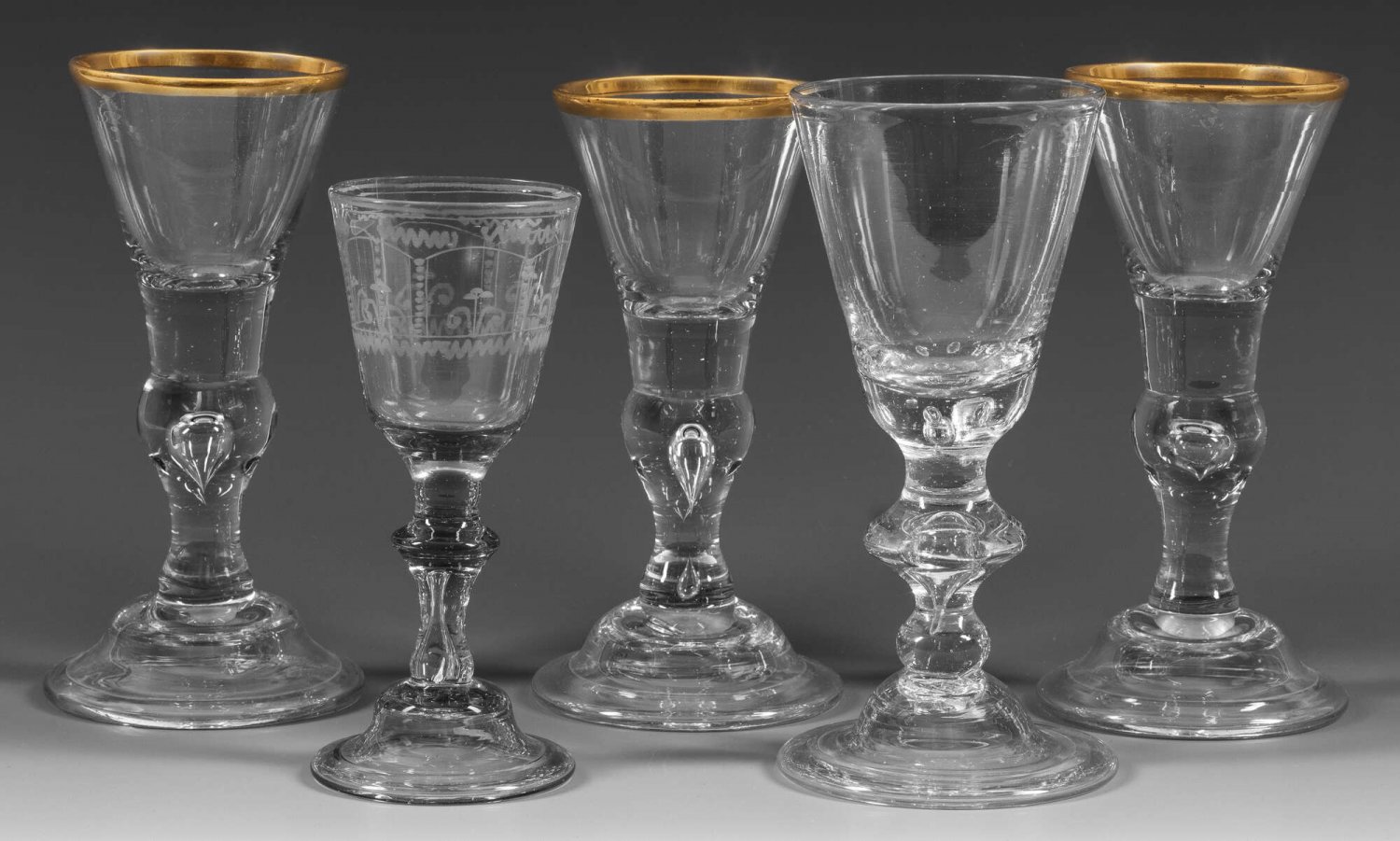 A collection of five German Baroque glass goblets. Amongst others three Lauenstein goblets with gilt rims and lion's mark.