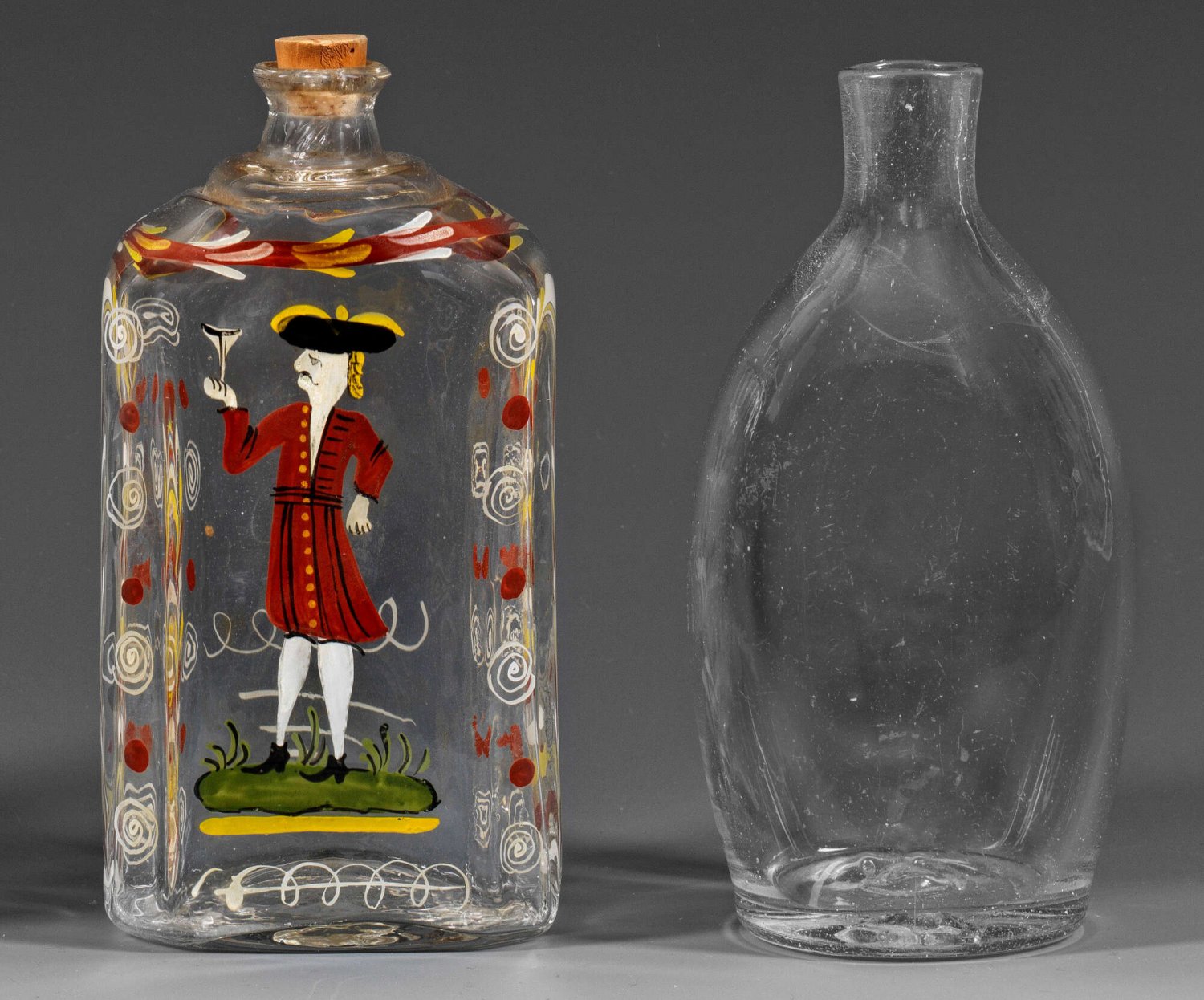 Zwei Branntweinflaschen Farbloses Glas. Ovoide, beidseitig abgeflachte Form bzw. mit länglich-achteckigem Querschnitt. Letztere mit der Darstellung eines trinkenden Herrn in polychromer Emailmalerei. H. 14,7 cm.