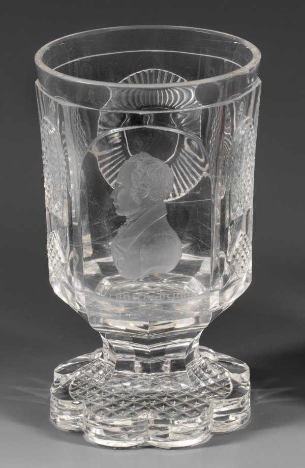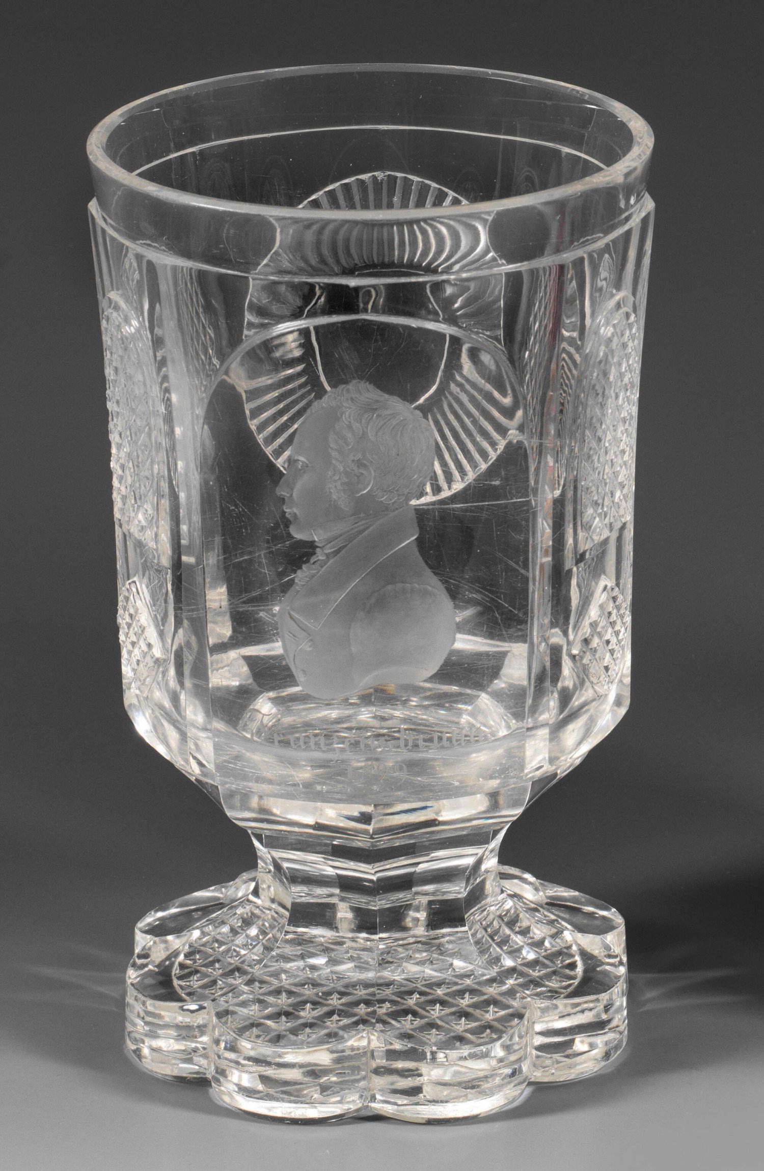 Seltener Biedermeier-Fußbecher mit Porträt Farbloses Kristallglas, geschliffen. Rosettenförmiger, facettierter Fuß mit gesteineltem Boden, die zylindrische, facettierte Kuppa mit hochgeschliffenen, gesteinelten Rundbögen und Quadraten, schauseitig fein geschnittenes Bildnis eines Herrn im Profil mit Inschrift "Franzensbrunn 1829", rücks. Verkleinerungslinse. Fußkante ger. best.; H. 16,5 cm.