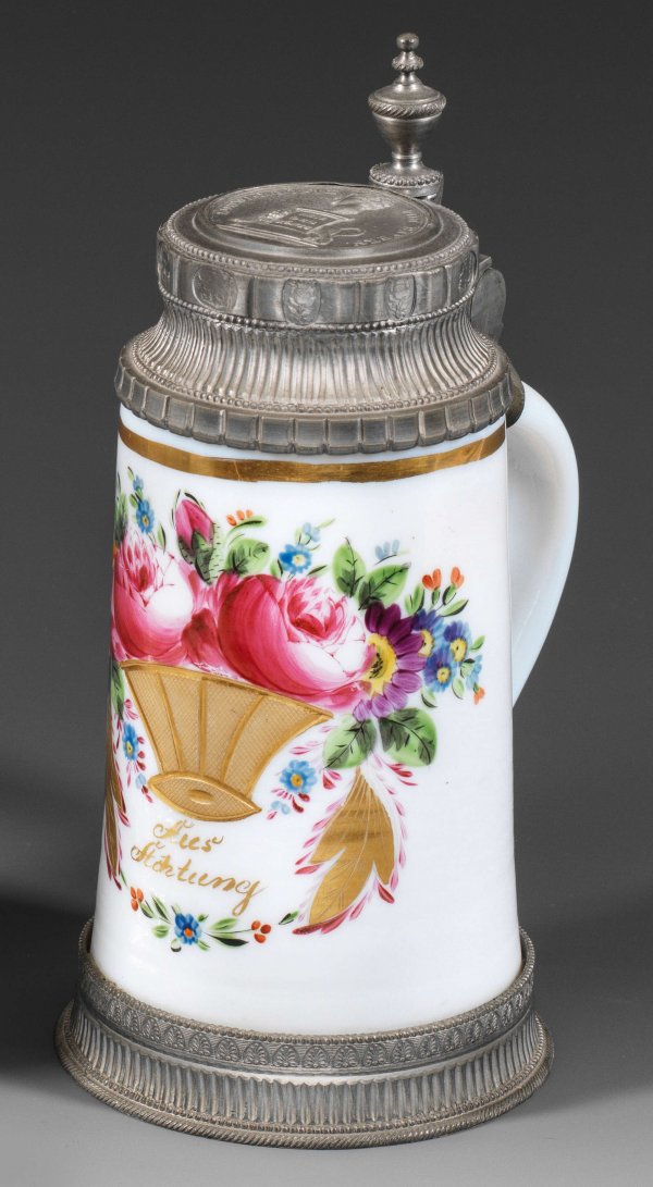 Biedermeier-Humpen Milchglas. Schliff- bzw. Schnittdekor, kombiniert mit polychromer Email- und Goldmalerei. Schauseitig ein Blumenkorb mit Inschrift "Aus Achtung". Fein reliefierte Zinnmontierung, im Zinndeckel ein eingelassenes Medaillon mit bayerischem Löwen, Bildnisbüste König Ludwig I. von Bayern und Inschriften "Heil dem König" und "Ludwig König von Bayern" (in Versalien). H. 20,5 cm.