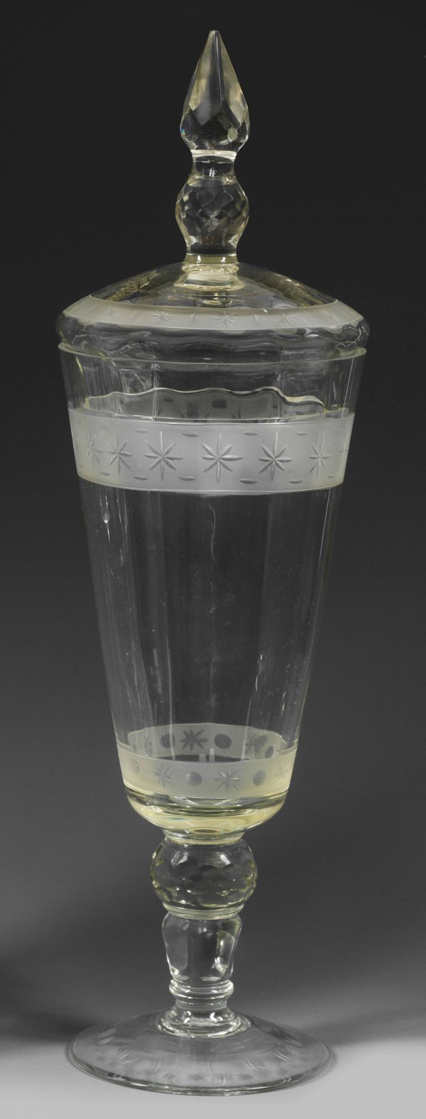 Großer Deckelpokal Leicht getöntes Glas, partiell geschliffen. Auf ansteigendem Scheibenfuß massiver Balusterschaft und konische, längsoptisch geblasene Kuppa. Korrespondierender Deckel mit hohem, gegliedertem Knauf. Auf der Kuppa und dem Deckel umlaufendes, satiniertes Band mit Sternschliffbordüre. Am Lippenrand äußerst minim. best.; H. 45,5 cm.