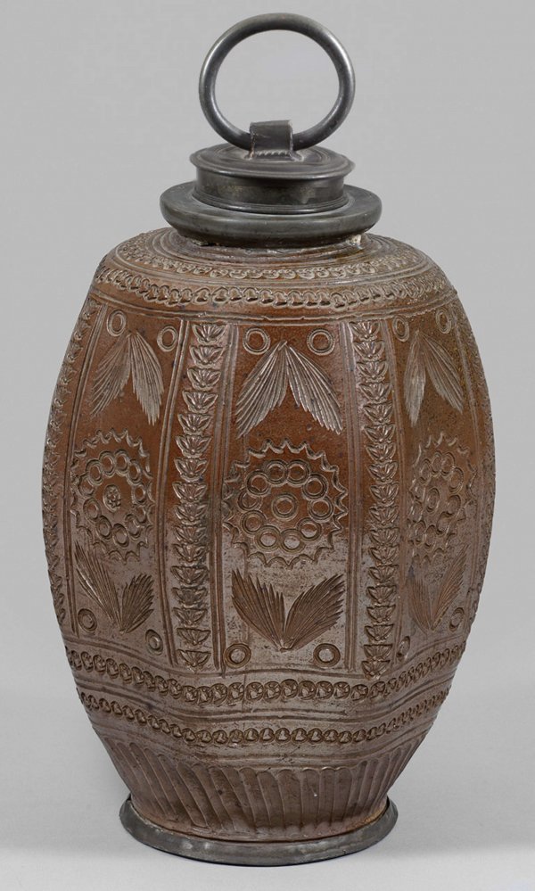 Große barocke Schraubflasche Salzglasiertes Steinzeug mit Braunsteinengobe. Ovoide, allseitig siebeneckig abgeflachte Form mit profiliertem, leicht ausgestelltem Fuß und durch Drehrillen akzentuierter Mündungszone. Flächendeckender Dekor aus stilisierten Blumen und Ornamenten, geritzt bzw. in Kerbschnitt sowie in Stempeltechnik. Zinnmontierter Fuß und Hals mit Schraubdeckel und Ringgriff. H. 32,5 cm (ohne Ringgriff).