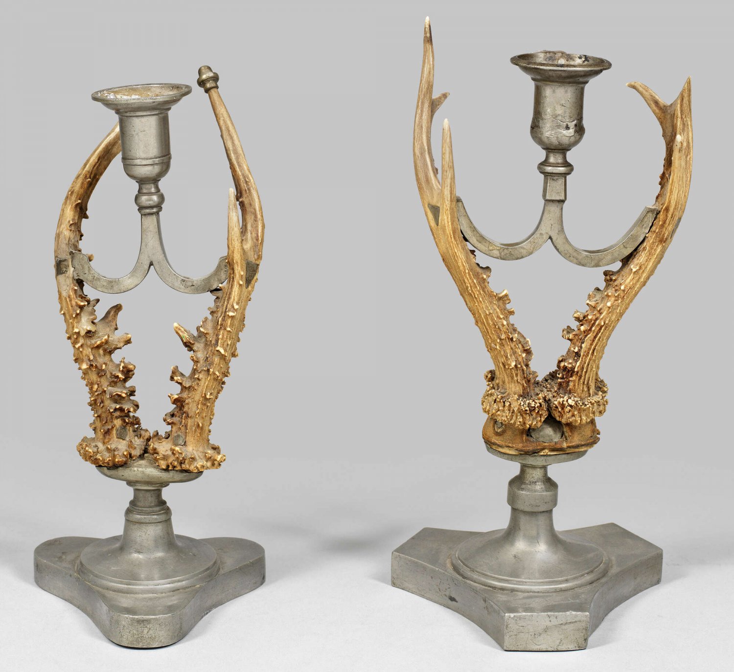 Paar Biedermeier-Jagdleuchter mit Gehörn 1-flg.; Zinn und Rehgeweih. Dreipassiger Zinnfuß, reich gestalteter Schaft aus Gehörn und Zinn, mittig montierte vasenförmiger Tülle. Meistermarke aus einem sechszackigen Stern mit Krone und Monogr. "CZ". H. 25,5 cm-27,5 cm.