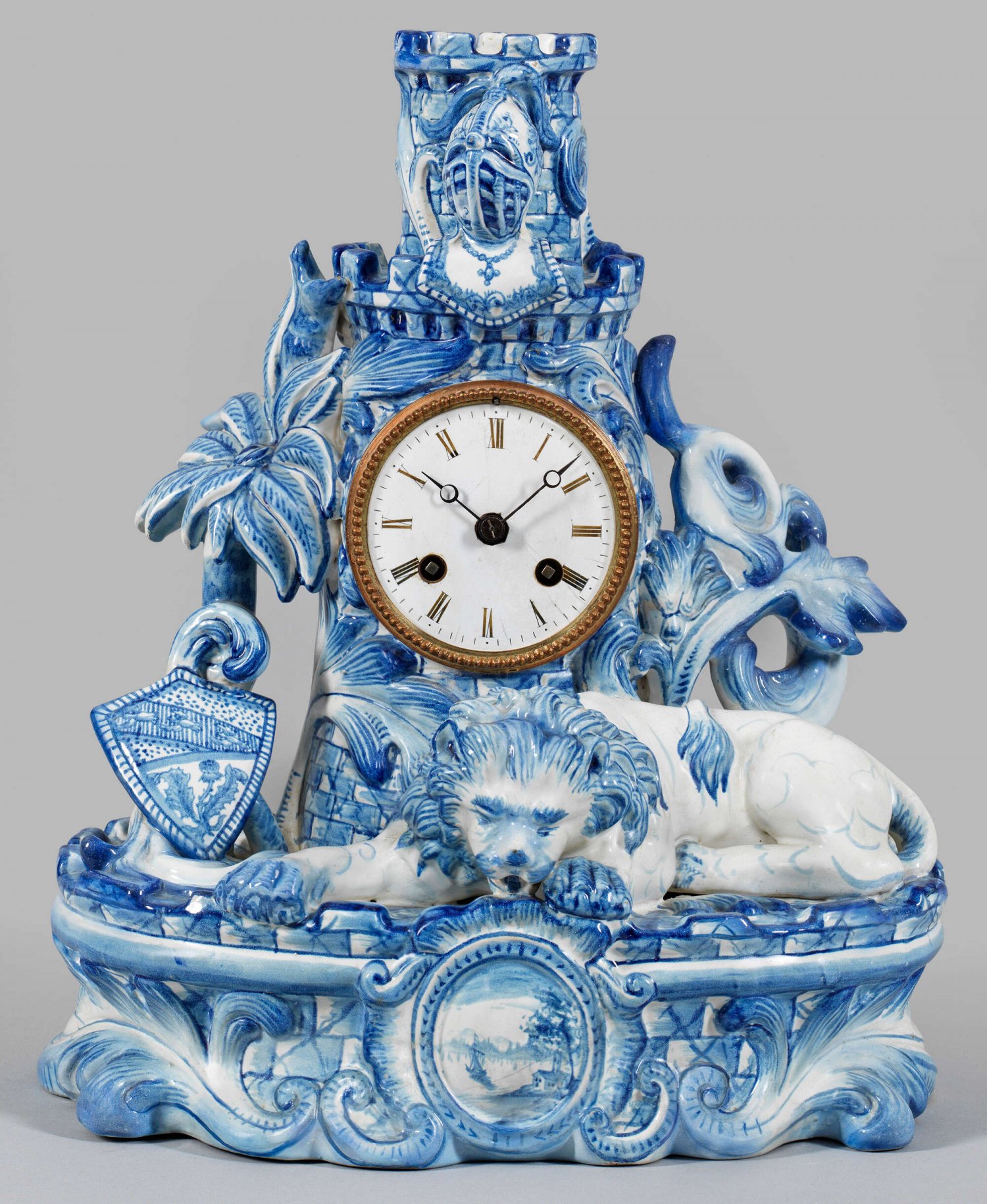 Große Figurenpendule mit Turm und schlafendem Löwen Fayence, kobaltblau bemalt. Reliefplastischer, ovaler Sockel mit Blättern und Zinnen, schauseitig eine Kartusche mit Landschaft. Darauf ein annähernd vollplastischer Löwe, eine Kartusche mit Wappen von Nancy und ein Burgturm mit Helm, flankiert von einer Palme und einer stilisierten Distel als Symbol für Nancy bzw. Lothringen. Im Turm eingelassenes Uhrwerk und weißes Email-Zifferblatt mit schwarzen, römischen Ziffern. Entw. um 1870. Rest., ohne Pendel. Sign./monogr. "S(t.) C(lemen)t K G". H. 35 cm.