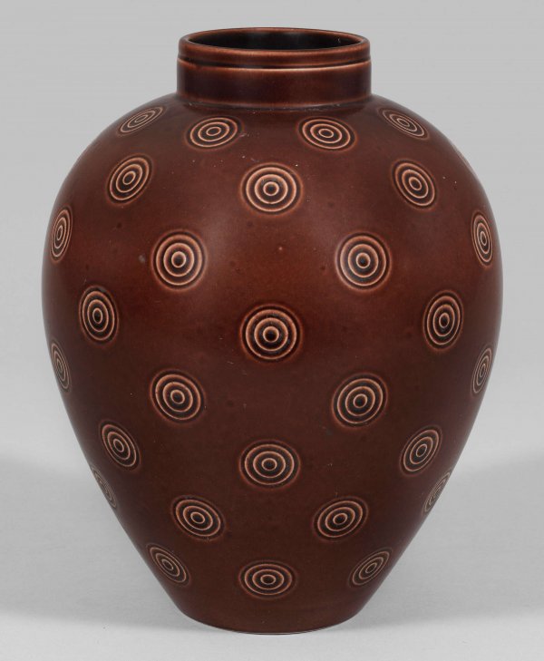 "Solbjerg"-Vase von Nils Thorsson Keramik. Ovoider Loropus mit kurzem Zylinderhals. Reliefdekor aus einem Muster mit konzentrischen Kreisen. Modell-Nr. 1577. Dunkelrote, seidenglänzende Glasur. Entw. Nils Thorsson. Manufaktur-Stempelmarke mit Bez. "DENMARK" und Modell-Nr.; H. 33 cm.