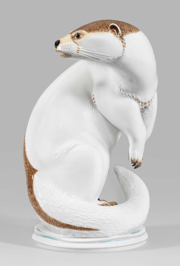 Große Figur eines Fischotters Auf einem Rundsockel hoch aufgerichtet sitzender, sich umwendender Otter. Stilisiert-reliefierte Fellzeichnung. Sparsame polychrome Malerei in Brauntönen, Schwarz und Blau. Entw. Max Esser, 1926. Schwertermarke. H. 43 cm.