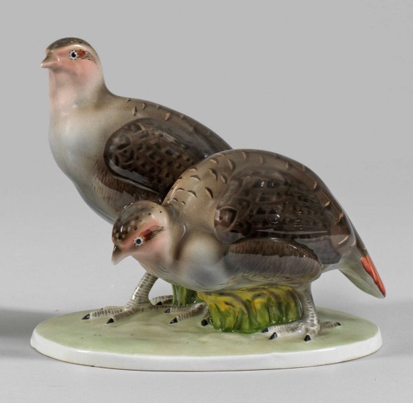 Rebhuhnpaar auf ovaler, Plinthe stehend. Naturalistisch gestaltetes Gefieder in feiner polychromer Malerei. Entw. Carl Nacke. Undeutliche Künstler-Bez.; Manufakturmarke. H. 15 cm. 17 cm x 13 cm.
