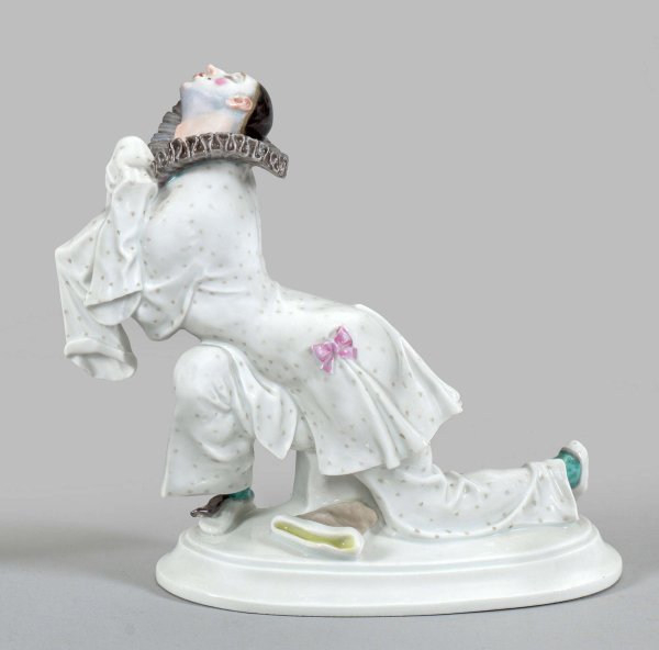 "Pierrot" aus dem Russischen Ballett Auf ovalem Sockel kniender Tänzer als Pierrot aus dem Ballett "Karneval" in flehender Pose. Polychrome Malerei. Entw. Paul Scheurich, 1912. Modell-Nr. D 283. Minim. best.; Glasurmakel. Schwertermarke. H. 18 cm. L. 19 cm.