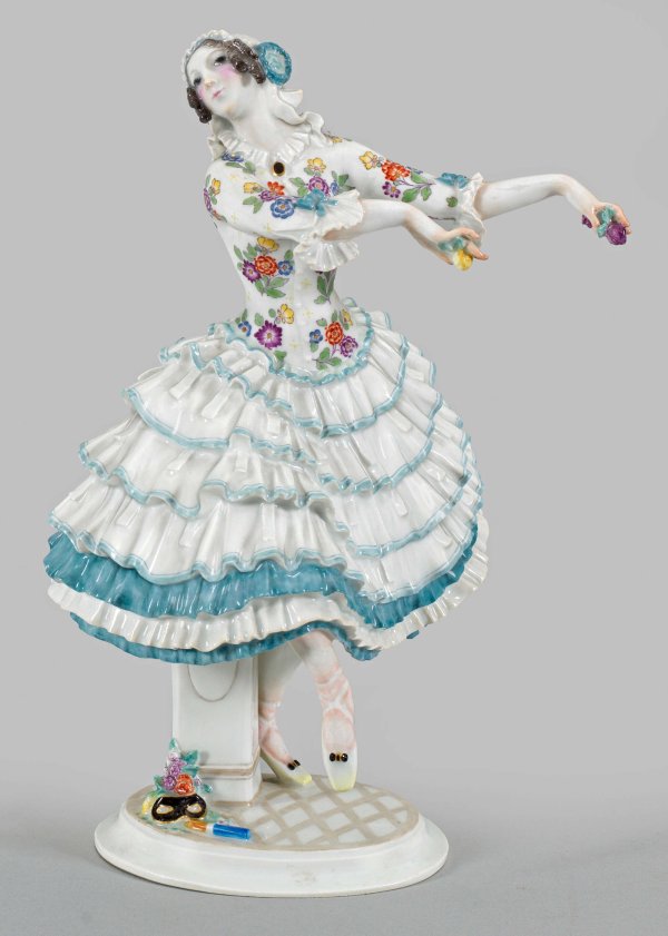 "Chiarina" aus dem Russischen Ballett Auf ovalem Sockel tanzende Chiarina aus dem Ballett "Karneval" mit Spitzenhaube in weitem, geblümten Krinolinenkleid. Zu ihren Füßen liegende Maske, Pritsche und Blumen. Polychrome Malerei. Minim. best.; Entw. Paul Scheurich. Modell-Nr. D 286. Rest.; Schwertermarke. H. 27 cm.