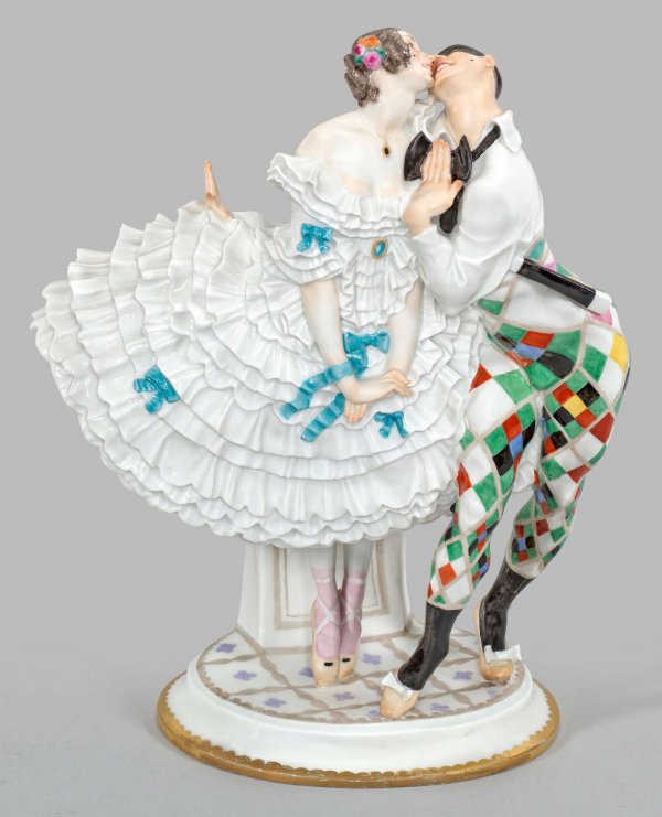 "Harlekin und Columbine" aus dem Russischen Ballett Auf ovalem Sockel nebeneinander stehendes Tänzerpaar, das sich in graziler Haltung zu einem Kuß neigt. Polychrome Malerei. Entw. Paul Scheurich, 1912/13. Modell-Nr. D 287. Brandrisse. Minim. rest./best.; Schwertermarke. H. 27 cm.
