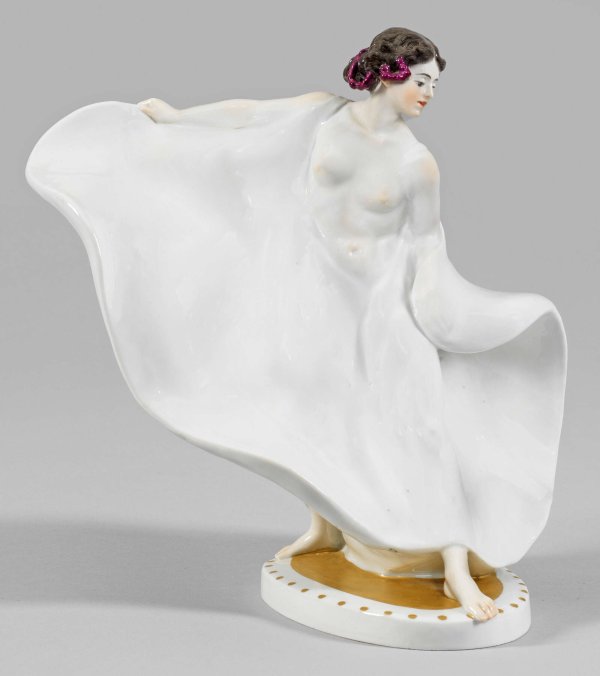 Jugendstil-Figur der Tänzerin "Loie Fuller" Vollplastische Darstellung der bekannten, amerikanischen Tänzerin bei der Darbietung des Tanzes "La Serpentin". Sparsame polychrome Malerei. Goldstaffage. Entw. Theodor Eichler, 1911. Modell-Nr. B. 255. Schwertermarke. H. 26 cm.