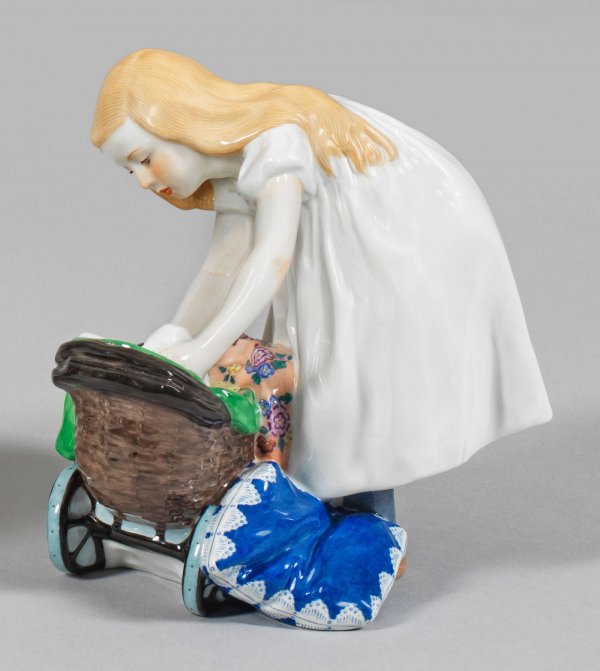 Mädchen mit Puppenwagen Sog. Hentschelkind. Stehendes Mädchen in langem weißen Kleid, fürsorglich seine Puppe im Wagen zurechtlegend. Polychrome Malerei mit wenig Gold. Entw. Konrad Hentschel, 1905. Schwertermarke. H. 13,5 cm.