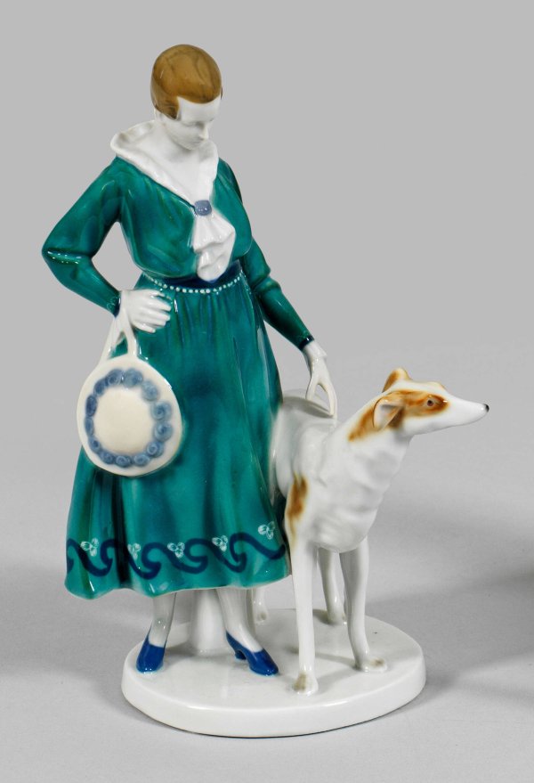 Jugendstil-Figur einer Dame mit Windhund Auf runder Plinthe stehende junge Dame in petrolfarbenem Kleid in Begleitung eines Hundes. Polychrome Unterglasurmalerei. Modell-Nr. 822. Manufakturmarke. H. 19 cm.