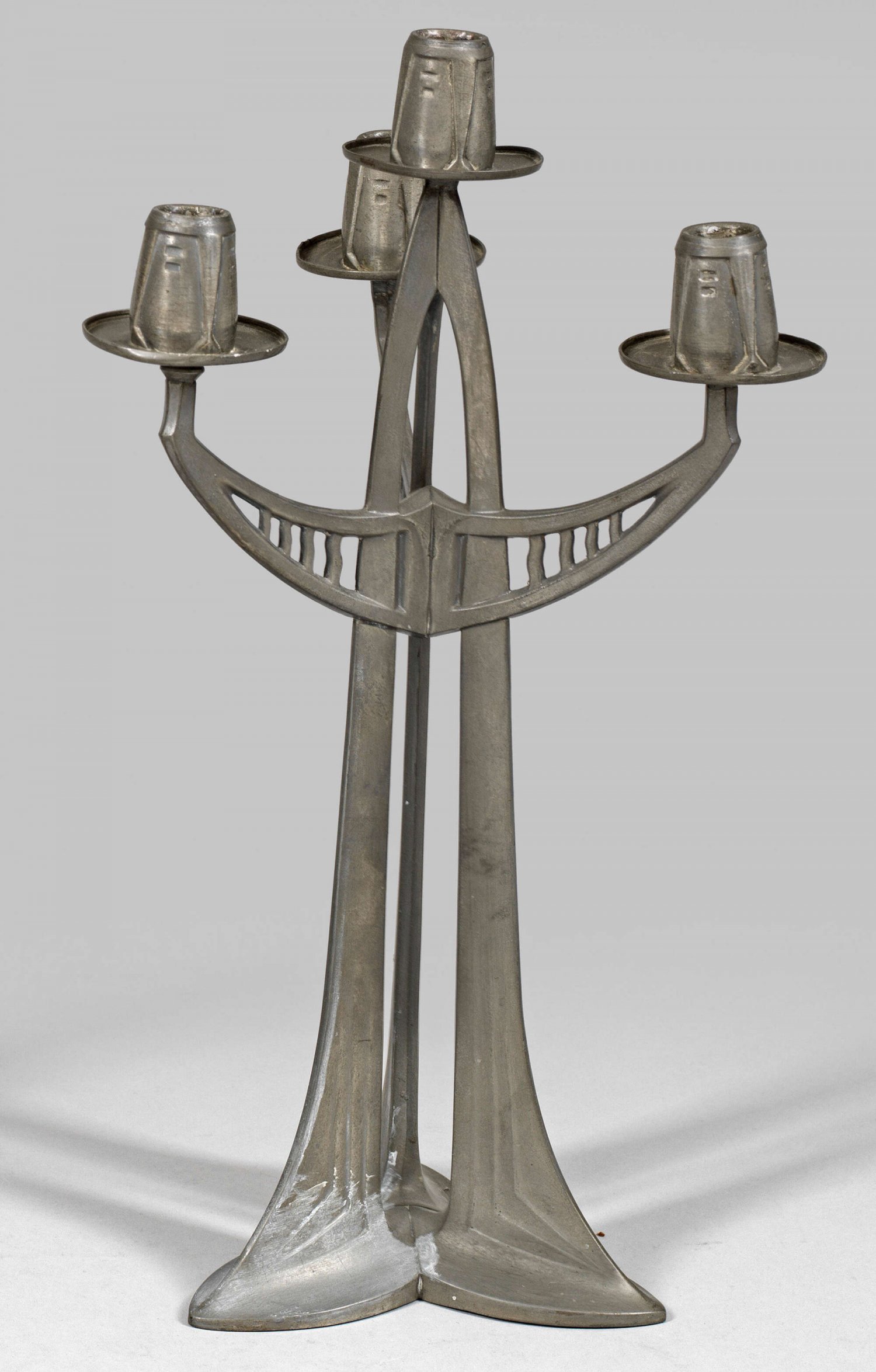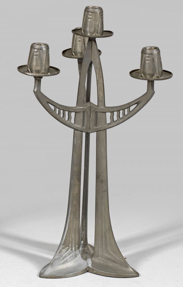 Jugendstil-Kandelaber 4-flg.; Zinn. Dreipassiger Fuß, durchbrochen gearbeiteter, aus Linienelementen und Bögen gestalteter Schaft mit korrespondierenden Leuchteramen, flachen Traufschalen und linear reliefierten Tüllen. Entw. Albert Reimann (attr.), um 1902. Modell-Nr. 590. H. 43 cm.