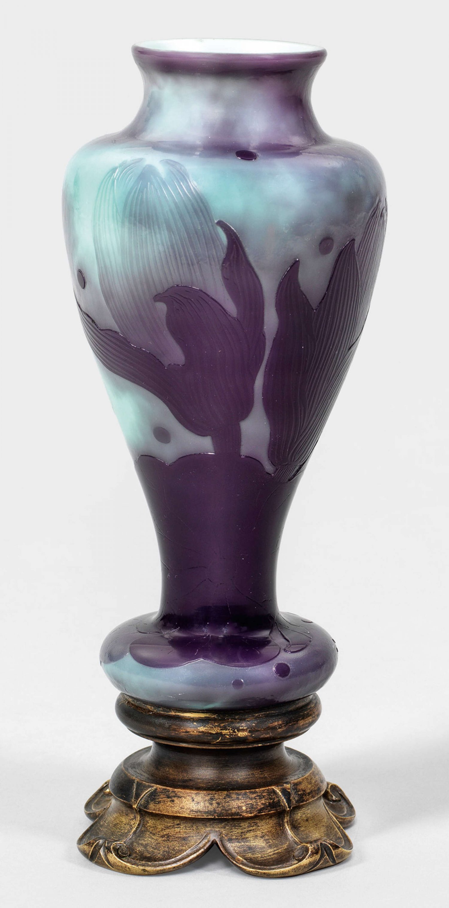 Schlanke Balusterform mit kugelig gebauchter Fußzone. Helltürkisgrünes, milchig-opalisierendes Glas, violett überfangen. In mehreren Arbeitsgängen ausgeführter, geätzter, geschnittener und feuerpolierter Dekor aus Seerosenblüten, der Hintergrund mit Marteléschliff. Fest montiert auf einem korrespondierenden, patinierten Bronzefuß in Form einer stilisierten Seerosenblüte. Japonisierende Sign. "Gallé". H. 25,7 cm.