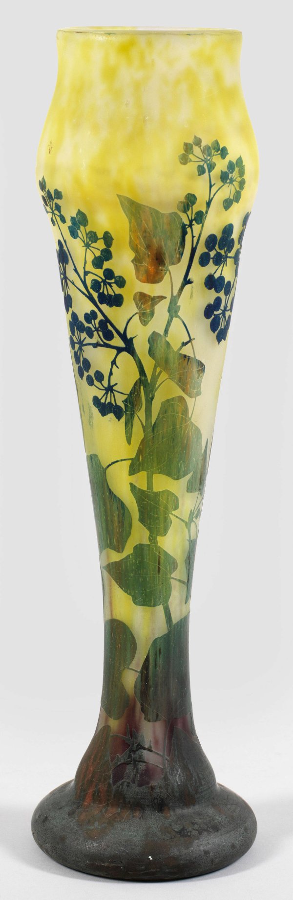 Große Daum-Vase mit Efeu-Dekor Schlanke Balusterform mit weit ausgestelltem Fuß. Farbloses Glas mit polychromen Pulverein- und -aufschmelzungen. In mehreren Arbeitsgängen geätzter Dekor aus Efeuranken mit Beerendolden (Hedera helix). Geschnittene Sign. "Daum Nancy" mit lothr. Kreuz. H. 51 cm.