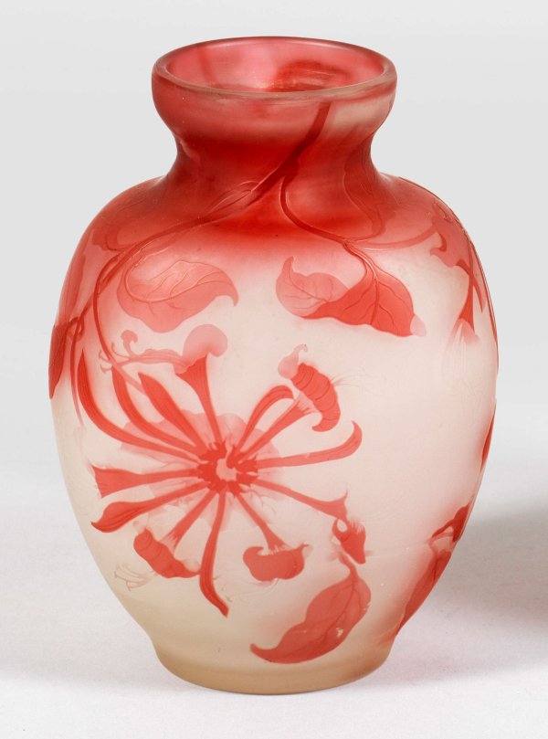 Gallé-Vase mit Geißblatt-Dekor Ovoider, leicht ins Oval gedrückter Korpus, verengter Hals, hochgezogener Lippenrand. Farbloses Glas, himbeerrot überfangen. In mehreren Arbeitsgängen geätzter Dekor aus blühenden Geißblatt- bzw. Jelängerjelieber-Ranken. Sign. Gallé. H. 18 cm.