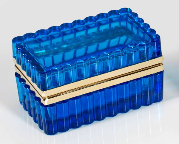 A French Art Deco corrugated cut and polished Persian blue glass box and brass-mounted hinged cover.