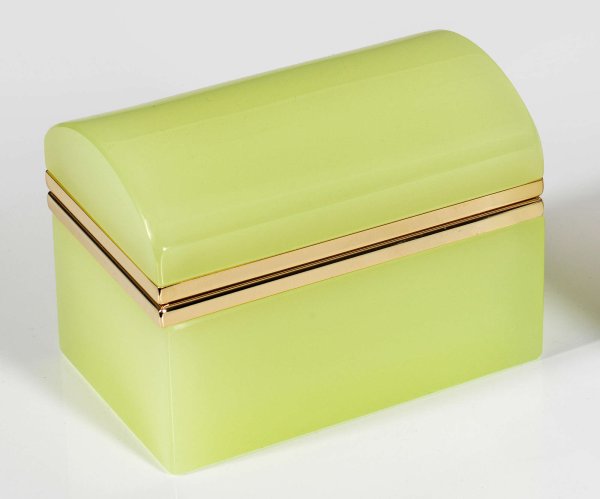 Art Déco-Dose Truhenform mit Runddeckel. Helles, gelbgrünes, geschliffenes und poliertes Opalglas. Scharnierte Messingmontierung. H. 9,7 cm. 13,5 cm x 8,5 cm.