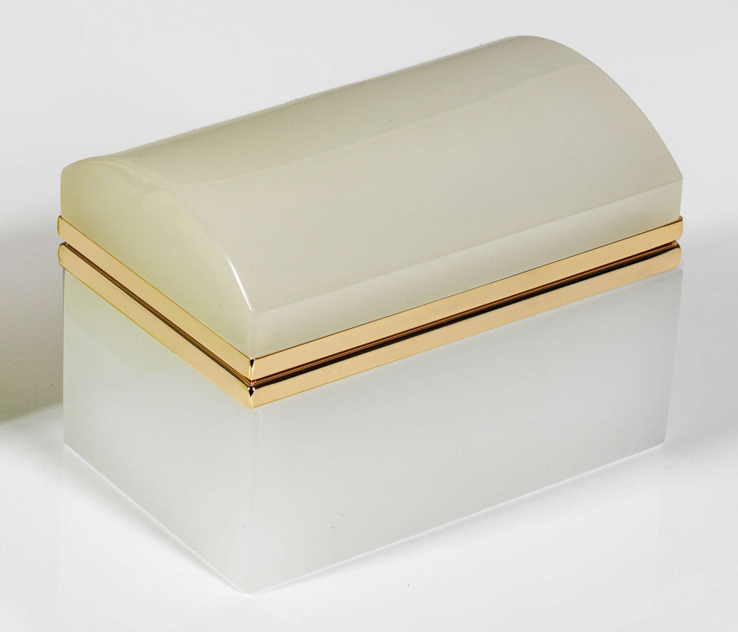 Art Déco-Dose Truhenform mit Runddeckel. Weißes, geschliffenes und poliertes Opalglas. Scharnierte Messingmontierung. H. 9,7 cm. 13,5 cm x 8,5 cm.