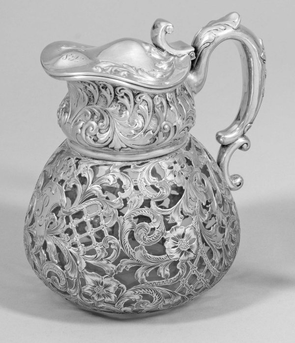 Jugendstil-Karaffe mit galvanischer Silberauflage. Glas. Gebauchter Korpus mit abgesetztem, gewölbtem Hals und geschweiftem Deckel. Wandung flächendeckend umzogen von gravierten Blütenranken. Auf Hals und Deckel reliefplastischer Akanthusblattdekor, dat. 1872/1897. Volutenhenkel. Gest. Sterling, Herstellerzeichen. H. 19 cm.