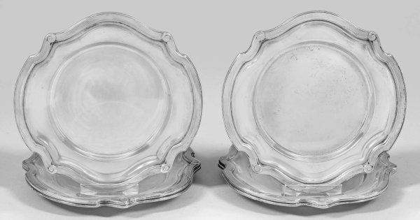 Sechs Brotteller Silber. Glatter Spiegel, übergehend in gering ansteigende Fahne. Geschweifter, von flachen Voluten gerahmter Rand. Minim. Gebrauchsspuren. Gest. Sterling, Herstellerzeichen. Gew. zus. ca. 1500 g. D. 18 cm.