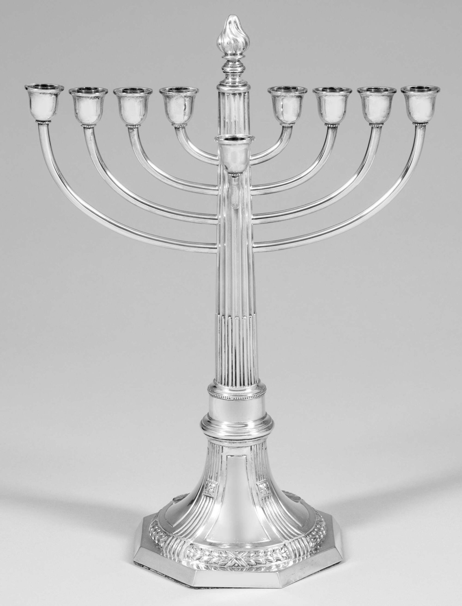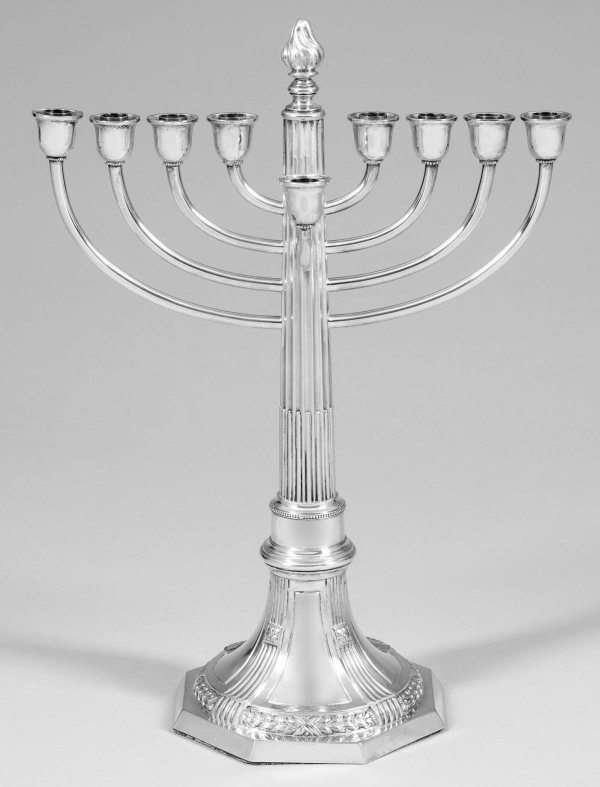 Großer Chanukkaleuchter im klassizistischen Stil. Silber. 9-flg.; Auf oktogonaler Plinthe runder, mit Blattkranz abgesetzter Fuß, in einen kannelierten Schaft übergehend, oben aufsitzend eine plastische Flamme. Acht paralelle Leuchterarme und kleinere Diener-Flamme im rechten Winkel dazu angesetzt. Gest. Mond, Krone, 800, Herstellerzeichen und Wortmarke. Gew. ca. 1000 g. H. 47 cm.