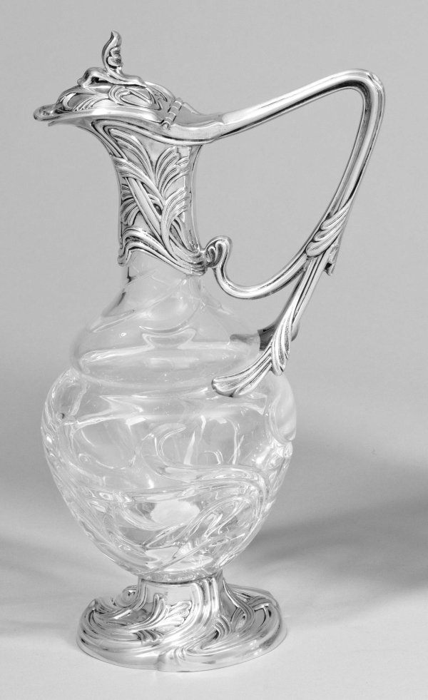 Karaffe mit Silbermontierung. Kugeliger, volutenförmig geschnittener Korpus aus farblosem Kristallglas. Auf glatter Montierung und flachem Deckel reliefplastischer, stilisierter Blattdekor in Jugendstilmanier. Gest. 925. H. 27,5 cm.