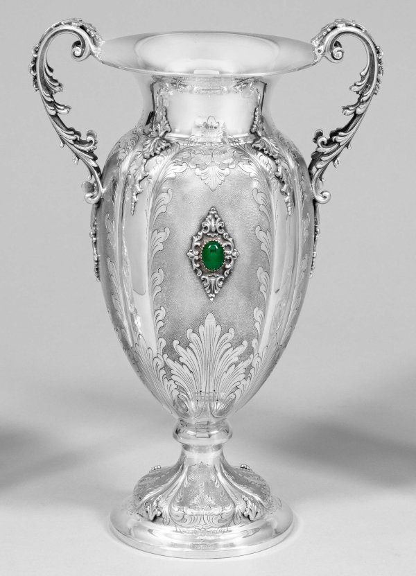 Dekorative Henkelvase Silber. Über gewölbtem Stand hoher, ovoider Korpus mit ausschwingendem Rand. Stand und Wandung gegliedert durch gravierte Blattranken in große Felder mit punziertem Grund. Wandung besetzt mit zwei Chrysoprasen. Blatthenkel. Gest. 800, Herstellerzeichen. Gew. ca. 1225 g. H. 36 cm.