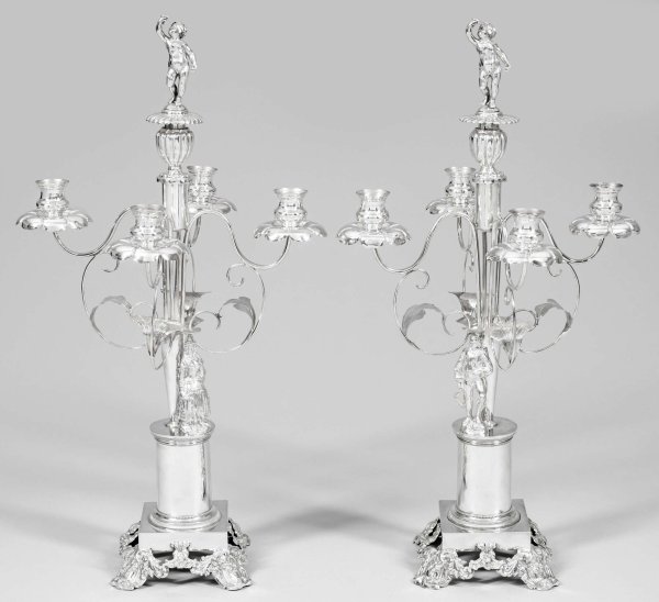 Paar Prunkgirandolen Silber. 5-flg.; Von Voluten und Rocaillen getragene, quadratische Plinthe. Auf hohem, von schmalen Friesen gerahmtem Säulenpodest stehende Gärtnerin bzw. Bauer in historisierender, ländlicher Tracht. Rückseitig aus einem Blütenkelch aufsteigende, geschweifte Leuchterarme mit vasenförmigen Tüllen über blütenartigen Traufschalen. Mittig herausnehmbare Bekrönung in Gestalt einer Amorette. Gest., Tremolierstrich, undeutl. Beschaumarken. Gew. zus. ca. 2100 g. H. 55 cm.