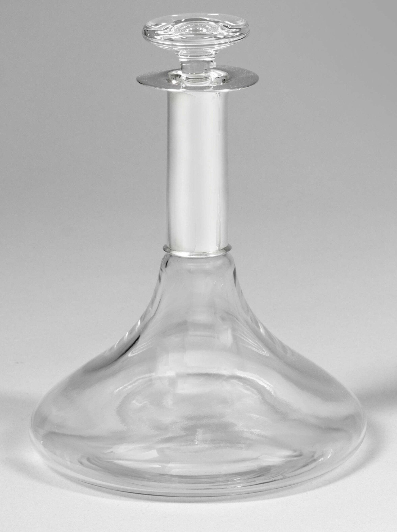 Decanter mit Silbermontierung. Kristallglas. Gebauchter Korpus mit schlankem Hals und flachem Stöpsel. Glatte Montierung, gest. 925. H. 25,5 cm.