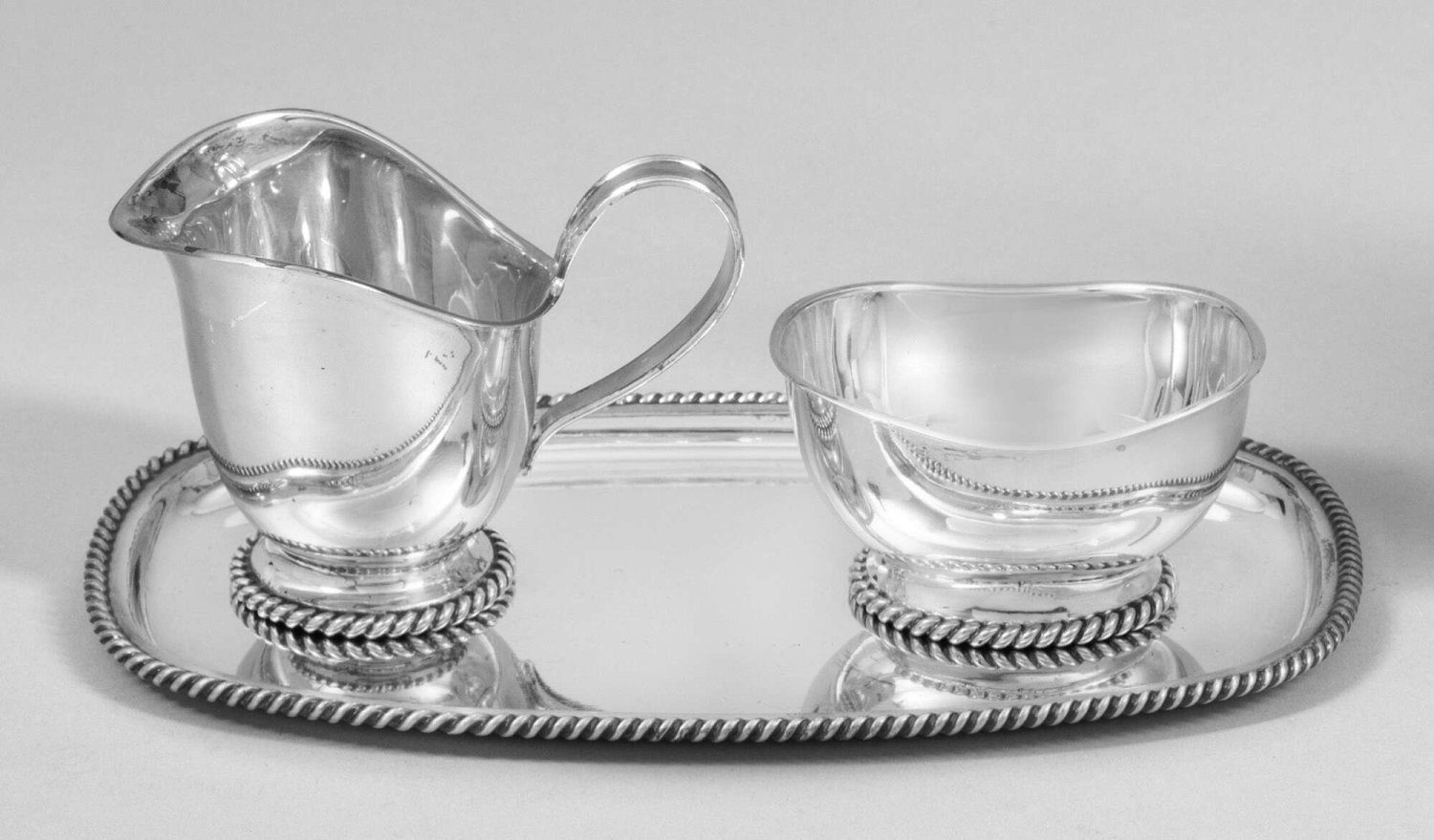Sahnegießer und Zuckerschale mit Tablett. Silber. Weit ausschwingender Korpus mit flachem, von einer Kordel gerahmtem Stand. Gest. 925, Herstellerzeichen. Gew. zus. ca. 250 g.