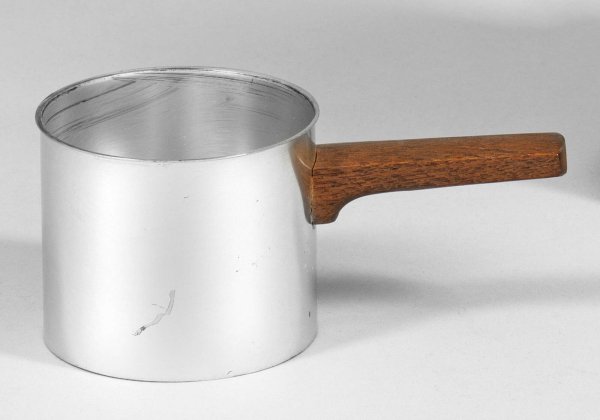 Design-Milchkännchen Neusilber, versilbert und Teakholz. Zylindrisch mit schmalem, ausgestelltem Rand und seitlich gekantetem, flachem Griff. Serie "Gerätegruppe m". Entw. Prof. Karl Dittert, 1960. Gem., Herstellerzeichen. H. 7 cm.