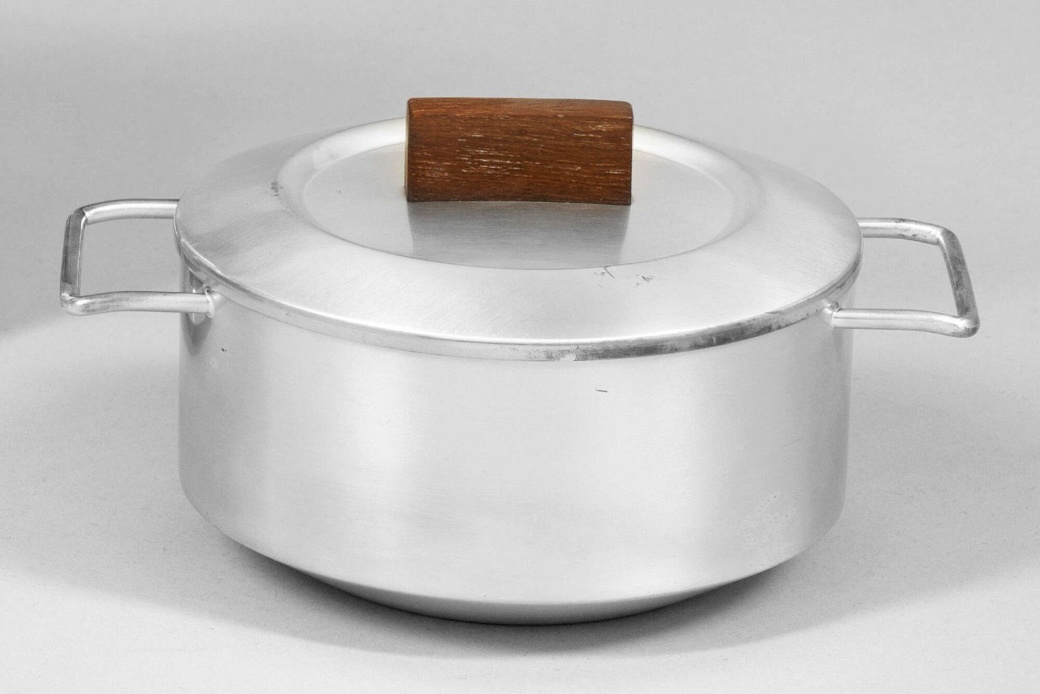 Design-Zuckerdose Neusilber, versilbert und Teakholz. Zylindrisch mit gekanteten Bandhenkeln. Mittig gering gemuldeter Deckel mit geometrischem Knauf. Serie "Gerätegruppe m". Entw. Prof. Karl Dittert, 1960. Gem., Herstellerzeichen. H. 8,5 cm. D. 12,8 cm.