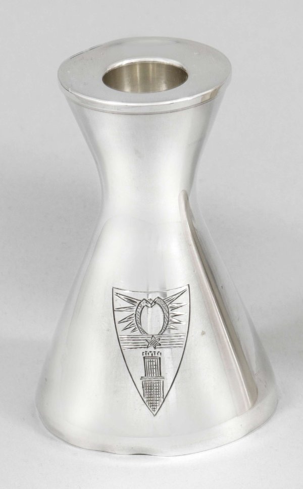 Kleiner Tafelleuchter Silber, beschwert. Kleiner, mittig gekehlter Leuchter mit glatter Wandung und flacher Tülle. Schauseitig graviertes Wappen. Entw. Prof. Karl Dittert, um 1960. Minim. best.; Gest. 835. H. 9 cm.