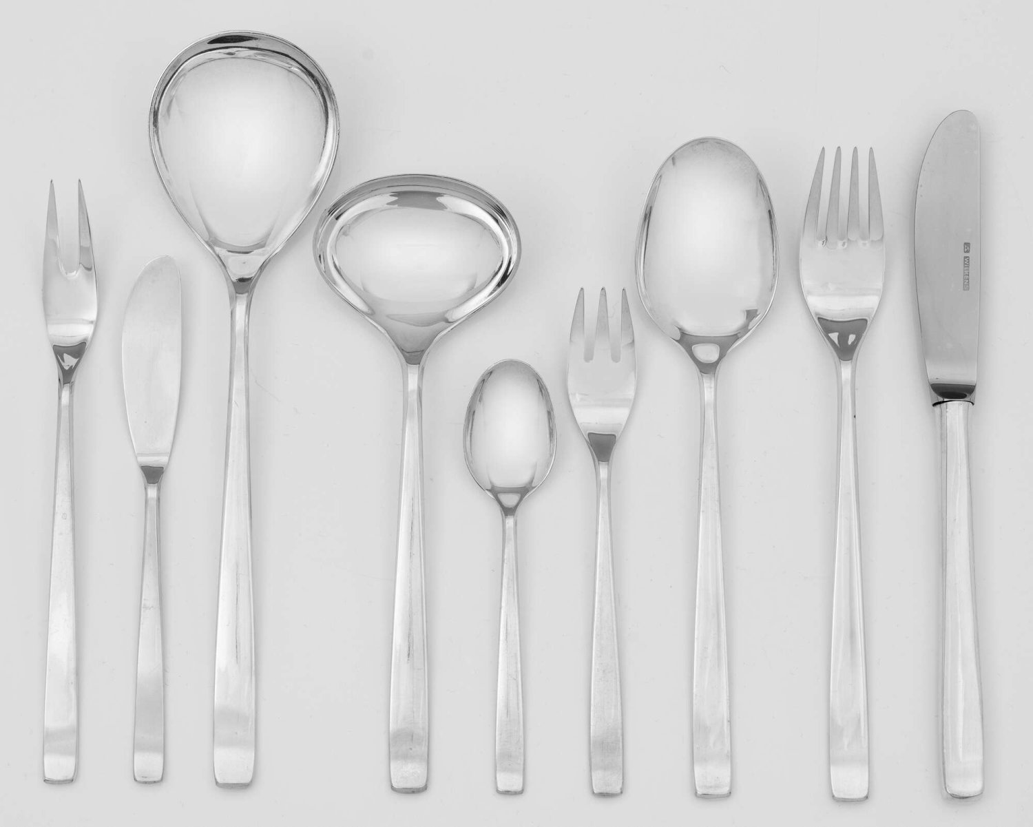 Modernes Speisebesteck "Cantone" für 12 Personen 72-tlg.; Silber. 12 Speisemesser, 12 -gabeln und 12 Suppenlöffel, 12 Kaffeelöffel, 12 Kuchengabeln, Tortenheber, Zuckerzange und -löffel, 2 Fleischgabeln, 2 Buttermesser, Kompottlöffel, 3 Gemüselöffel und Soßenkelle. Schlichtes Design mit kantigen, an den Enden abgerundeten Griffen. Modell Cantone, Entw. Kerstin Nolte. Gebrauchsspuren. Gest. 800, Herstellerzeichen. Gew. zus. ca. 3120 g.
