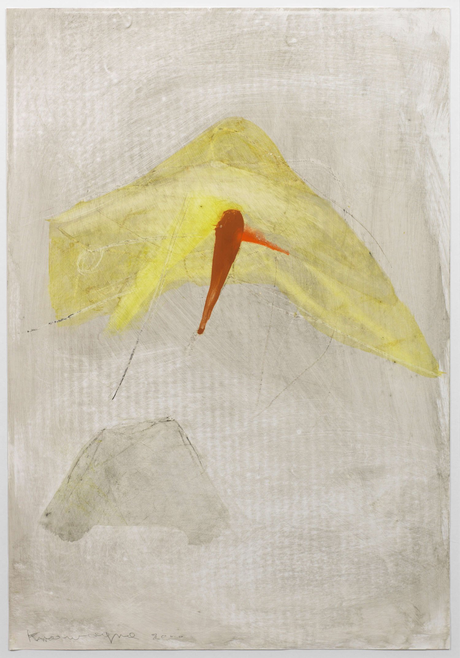 Assoziative Komposition Krawagnas, der vergleichbar mit Julius Bissier in seinen der Abstraktion zugewandten Arbeiten oft in sparsamer Weise kalligraphische bzw. zeichenhafte, formelhafte Elemente einsetzt, um das innerlich oder äußerlich Gesehene zum Ausdruck zu bringen: auf diesem Blatt der gelb-rote Drachen auf lichtgrauem Hintergrund. Krawagna studierte 1953-1957 zunächst an der Kunstschule in Linz, danach bis 1961 an der Akademie in Wien und 1963/64 der École des Beaux Arts in Paris. Mischtechnik/Papier. Sign. u. dat. 2000. 84 cm x 59 cm.