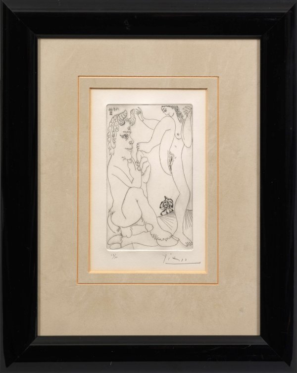 Radierung/Papier, 1968. Aus der Serie 347, die Picasso von März bis Oktober 1968 erschaffen hat. Im Laufe von 204 Tagen entstanden die insgesamt 347 Motive der Suite, die seinen bis ins Alter ungebrochenen, fieberhaften Schöpferdrang vor Augen stellen. Zur Durchführung des Mammutprojekts hatten die Drucker Aldo und Piero Crommelynck eigens in einer alten Backstube nahe beim Atelier des Künstlers in Mougins eine Druckerei eingerichtet. So konnte Picasso den Druck fortlaufend überwachen. Druck Aldo und Piero Crommelynck. Herausgegeben von der Galerie Louise Leiris, Paris, 1969, in einer Auflage von 50. Sign. und nummeriert 24/50. Plattenmaß 18,8 cm x 11,2 cm. Passepartoutausschnitt 24 cm x 15 cm. Rahmen.